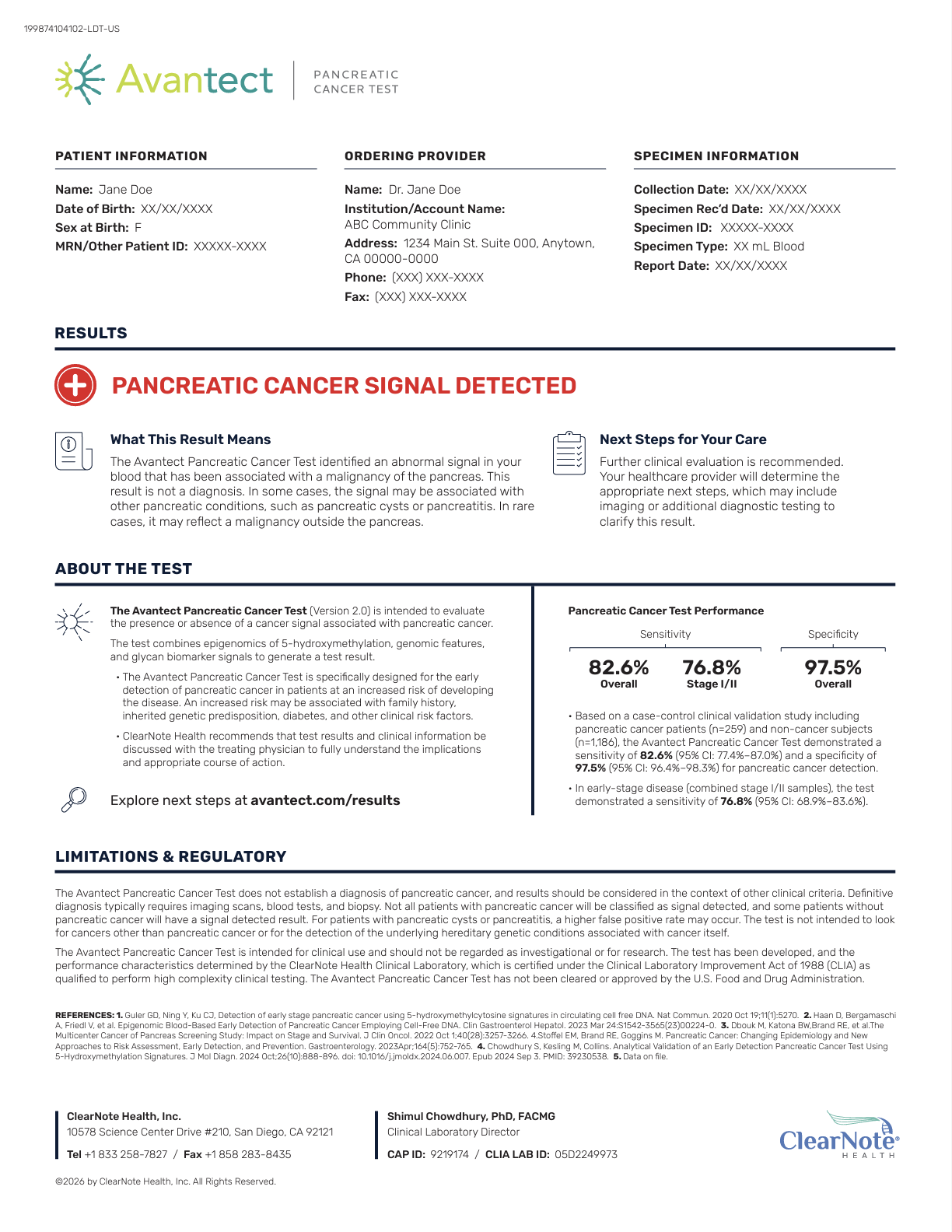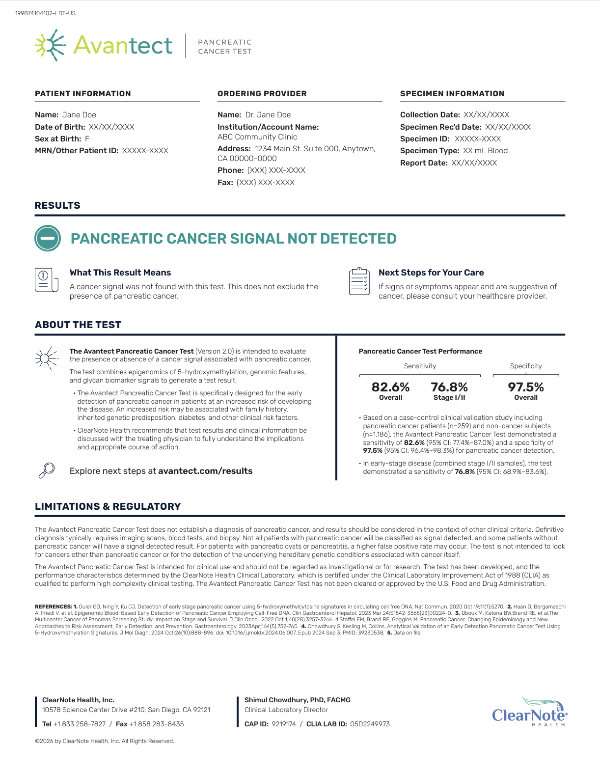 The Avantect Pancreatic Cancer Test is an early detection test. The test does not establish a diagnosis of pancreatic cancer, and results should be considered in the context of other clinical criteria. Definitive diagnosis of pancreatic cancer usually requires a series of imaging scans, blood tests, and a biopsy. Not all pancreatic cancers will be detected. Some patients with pancreatic cancer may have a “Pancreatic Cancer Signal not detected” result. Some patients without pancreatic cancer may have a “Pancreatic Cancer Signal detected” result. False-negative and false-positive results are possible. A “Signal not detected” result does not guarantee that no pancreatic cancer is present. In some cases, no result is obtained. While this is very uncommon, it may be caused by shipping delays or when there is not enough cell-free DNA for the test in the patient’s blood. If this happens, we generally ask for a repeat blood sample for testing at no extra cost.
